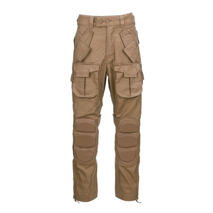 Stoere combat broek, voorzien van zakken op bovenbeen en dijbeen, en twee achterzakken.