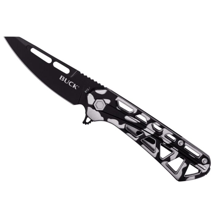 De Buck Zakmes Mini Trace Ops Camouflage is een EDC (Every Day Carry) mes met een unieke styling. Het lemmet is gemaakt van 7Cr staal, deze instap staalsoort laat zich eenvoudig slijpen en is meer dan geschikt voor alle dagelijkse snijtaken. Verder is het lemmet uitgerust met een flipper zodat het mes gemakkelijk en snel één handig geopend kan worden, vervolgens houdt de linerlock het mes stevig in geopende stand. Het opengewerkte geanodiseerd aluminium heft geeft het mes een unieke uitstraling, ook besparen deze uitsneden gewicht. Verder heeft aluminium een verfijnde uitstraling en een goede slijtvastheid. De Buck Mini Trace Ops is uitgevoerd met een omkeerbare draagclip, deze houdt het mes stevig op zijn plek aan riem of in een zak.Kenmerken: