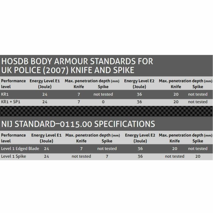 Gebruik deze upgrade panelen in combinatie met 1 van de overige Soft-Armer kogelvrije panelen zoals COMFORT II om te voldoen aan NIJ-0115.00 Niveau 1 bescherming tegen messen.