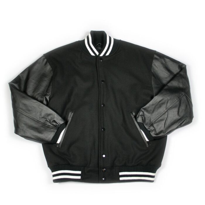 Zwart baseball jack van wol met lederen mouwen. Met 2 zijzakken en 1 binnenzak met drukknopen.