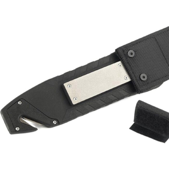 In de hard kunststof schede is een firesteel, gordel-lijnsnijder en diamantslijper inbegrepen.