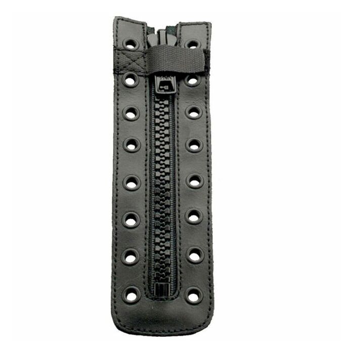 De ritslock voorkomt het opengaan tijdens het dragen. De rits is van leer met nylon tanden en roestvrije stalen ringen.