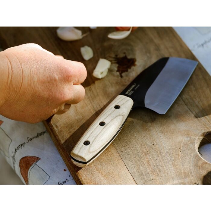 De Morakniv Outdoormes Rombo een handgemaakt outdoor cooking mes onmisbaar voor elke reislustige kookliefhebber. Het Full-Tang lemmet loopt volledig door in de handgreep en is taps toelopend geslepen. De ergonomisch gevormde greep zorgt voor een goede gewichtsverdeling in de hand en verhoogt het snijgemak. Met zijn hoge lemmet kun je grote stukken vlees, vis of groeten gemakkelijk in porties verdelen en opscheppen. Breng uw volgende maaltijd op smaak met de outdoor voorraadkast, het bereiden van uw eten zal voor altijd unieke culinair zijn ervaring. “Als we het hebben over de messen van Mora, moeten we de bekwame vakman Rombo-Anders Eriksson en zijn innovatieve geest noemen. Het was tijdens een lunchpauze aan het einde van de 19e eeuw toen hij de nieuwe broodtrommel van zijn zoon Carl zag, gemaakt van gevulkaniseerde vezel. Onmiddellijk zag hij het potentieel, sneed er een stuk uit en transformeerde dat in een messenschede. Of hij ooit de broodtrommel van zijn zoon heeft vervangen, is nog steeds onduidelijk, maar zijn levenswerk en nalatenschap leven voor altijd voort.”Het vlijmscherpe lemmet is gemaakt van 100% gerecycled Zweeds RVS, een duurzame en lokale manier om met een schaars materiaal om te gaan. Deze staalsoort heeft een uitstekende taaiheid, scherptebehoud en duurzaamheid. Een goede keuze voor een allround outdoor kookmes. Het lemmet is afgewerkt met een zwarte PC-coating, deze geeft het lemmet een unieke uitstraling en contrasteert prachtig met de glanzende scandi grind snede. De Rombo heeft een ergonomisch gevormd heft en is gemaakt van blank essenhout afkomstig uit Europese FSC® bossen. Essenhout is een verbazingwekkend materiaal dat van nature duurzaam is. Het hout is enkel behandeld met een beschermende laag was, hierdoor blijven de eigenschappen van het hout zijn gehele levensduur behouden. De bijgeleverde schede beschermt de snede en voorkomt ongewenst snijden. De schede is gemaakt van plantaardig gelooid leer, hierdoor is het leer op een natuurlijke manier beschermd tegen de elementen. Ook zal het leer tijdens zijn leven een patina ontwikkelen die het verhaal van zijn gebruik verteld en elk mes uniek maakt.