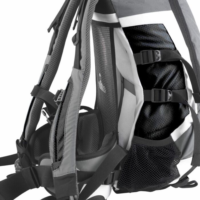 Voor de hele rugzak worden sterke, maar toch lichtgewicht materialen gebruikt; een geïntegreerde regenhoes biedt uitkomst bij slecht weer.