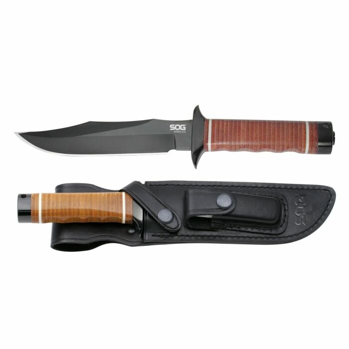 Bowie knife met een zwart lemmet en lederen heft. Inclusief zwart lederen sheath.