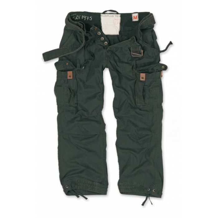 Prachtige legerbroek, inclusief bijpassende riem en veel zakken die voorzien zijn van drukknopen versterkt met lederen bevestigingen.