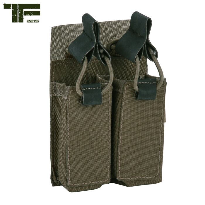 De TF-2215 Double Pistol Pouch is gemaakt van duurzaam 500D Cordura materiaal en geschikt voor 2 pistoolmagazijnen. De pouch kan bevestigd worden op het TF-2215 Modular Vest of de TF-2215 Rig en ook op andere vesten en platen die over klittenband beschikken.