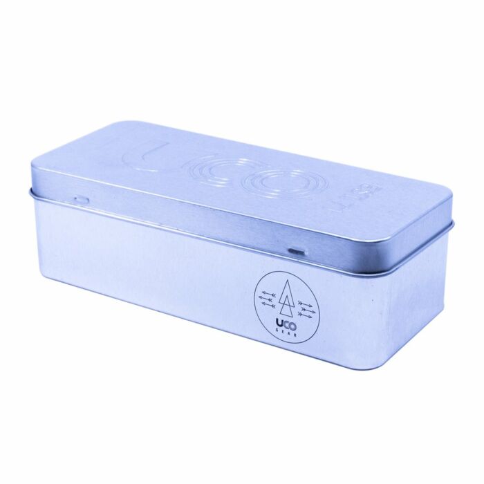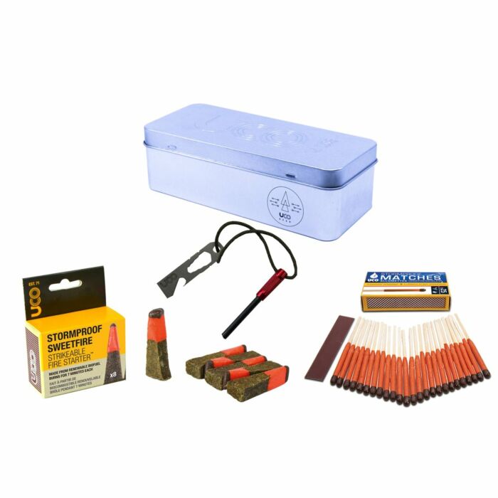 Survival kit in blikken doosje met drie essentiële producten om vuur te maken.